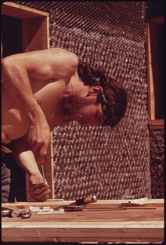 Image of a Carpenter Fitting a Handmade Door for an Experimental Can Home near Taos, New Mexico.